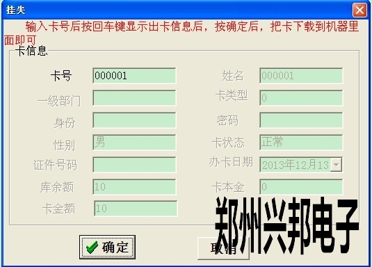 1. 打開(kāi)485售飯機(jī)軟件--卡掛失,輸入卡號(hào)后按回車(chē),當(dāng)出現(xiàn)卡信息時(shí)點(diǎn)確定鍵即可掛失此卡。