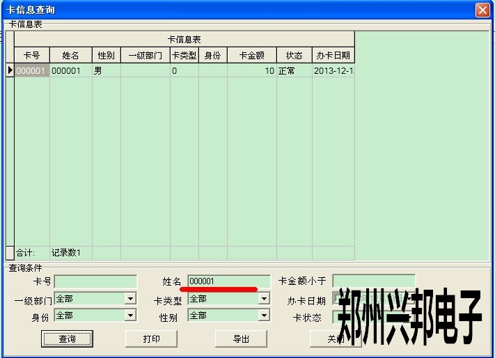 如果不知道此卡的卡號(hào),可以從卡信息表中查看到此卡的信息,點(diǎn)數(shù)據(jù)管理--卡信息表,打開(kāi)此表后輸入姓名,然后查詢就可以查看到此卡的卡號(hào),然后再掛失即可,如下圖所示
