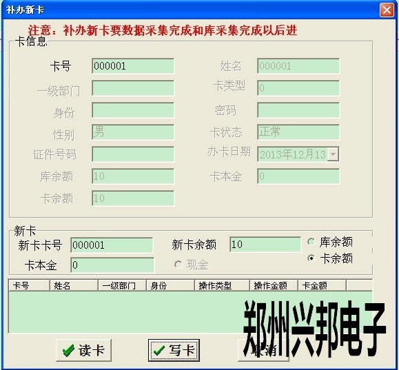 2. 此卡掛失后,然后點(diǎn)卡管理--補(bǔ)辦新卡,打開(kāi)此對(duì)話框后輸入卡號(hào)后按回車(chē)鍵,當(dāng)出現(xiàn)卡信息時(shí),把新卡放到讀卡器上點(diǎn)讀卡,然后點(diǎn)寫(xiě)卡即可,如下圖所示