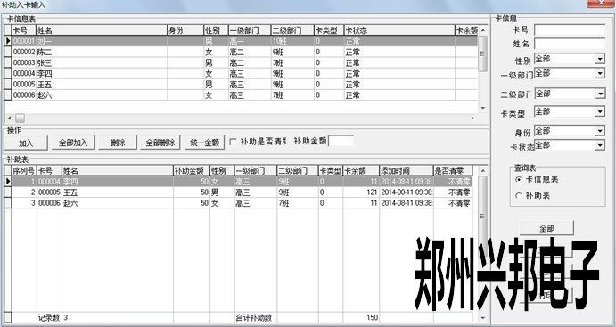 1.485軟件打開后,點一下卡管理--補助入卡--補助入卡輸入,打開補助入卡輸入窗口,在右卡信息中輸入想要添加的人員條件后,點擊下面的查詢,然后在左邊的補助金額后面的框中填寫補助金額,可以選擇是否清零,若選擇補助清零,在領取補助時會將卡上的金額先清零再補助上此次的金額;若選擇不清零,則在領取補助時會累加之前卡上的金額。點擊全部加入,就給選出來的人員生成補助.關閉此畫面,如下圖所示。