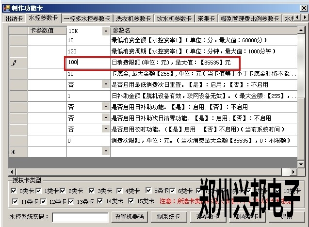 2)打開軟件 制卡中心-功能卡制作-水控參數卡中的日限額,輸入要設置的值,以元為單位,如下圖所示,代表100元,最大可設置到65535元,設置好后點擊制參數卡即可;