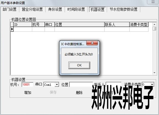 在軟件上添加水控機(jī),售飯機(jī)相應(yīng)的機(jī)器號(hào):打開(kāi)軟件,系統(tǒng)管理---用戶(hù)參數(shù)設(shè)置---用戶(hù)基本參數(shù)設(shè)置---機(jī)器設(shè)置,在機(jī)號(hào)那添加相應(yīng)的機(jī)器號(hào),例如10001就是1號(hào)機(jī),串口選擇電腦所用的通訊串口。如下圖所示,圖中所用的通訊串口為COM1。但在極其特殊的情況下,會(huì)出現(xiàn)錯(cuò)誤提示,機(jī)器號(hào)開(kāi)頭為0。如圖所示。