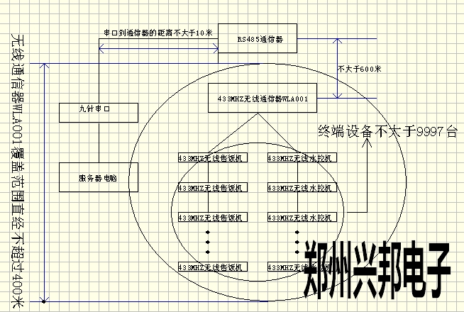 433MHZ無線通信器(WLA001)使用框圖如下所示,一個433MHZ無線通信器(WLA001)的無線覆蓋范圍為直經400米(空曠地區(qū));只要在收發(fā)的范圍內,可連接的終端設備的臺數理論上沒有限制;地址號9998、9999,終端設備不可用,系統(tǒng)使用;