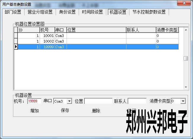 在機器設(shè)置中可以添加機器,設(shè)置機器號、串口以及消費卡類型,位置、聯(lián)系人可以選填。其中設(shè)置機器號必須輸入5位,開頭為1,最大可設(shè)置為19999.串口是指通訊器連接電腦的端口號,此處的串口號選擇不正確的話會導致機器不通訊。