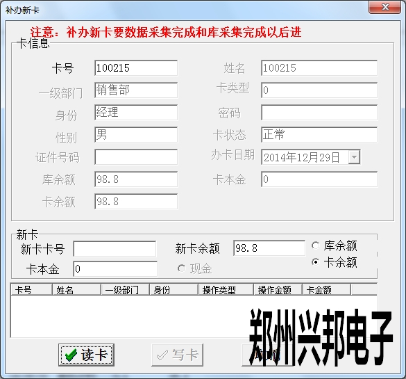 注: 收繳舊卡是卡片不再使用將卡片收回的操作,進(jìn)行讀卡,卡庫一致的情況下就可進(jìn)行寫卡,退還卡余額完成操作。收繳回來的卡可以重新發(fā)行。