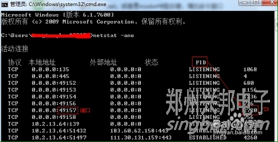 輸入命令:netstat -ano,列出所有端口的情況。在列表中我們觀察被占用的端口,比如是49157,首先找到它