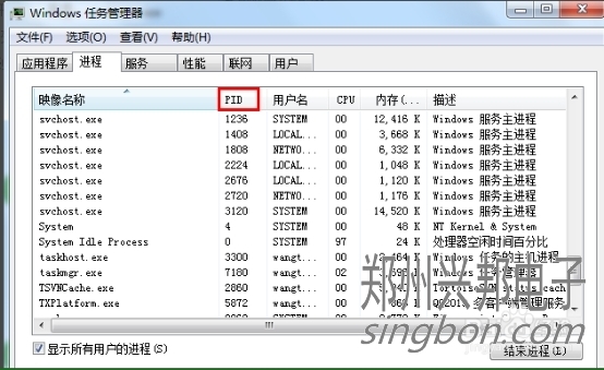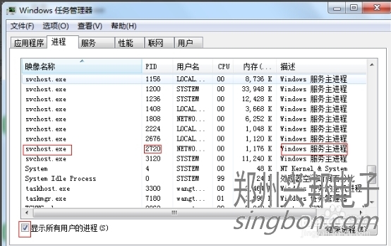 這樣我們就看到了PID這一列標(biāo)識(shí),看一下2720對(duì)應(yīng)的進(jìn)程是誰(shuí),如果沒(méi)有,我們把下面的顯示所有用戶的進(jìn)程前面的勾打上,就可以看到了,映像名稱是svchost.exe,描述是,Windows的主進(jìn)程,與上面命令查看的完全一致。