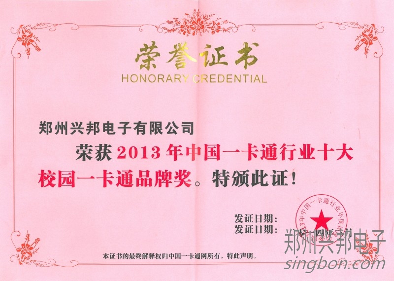 興邦電子榮獲2013年度十大校園一卡通品牌,此獎牌由中國一卡通網評選、頒發